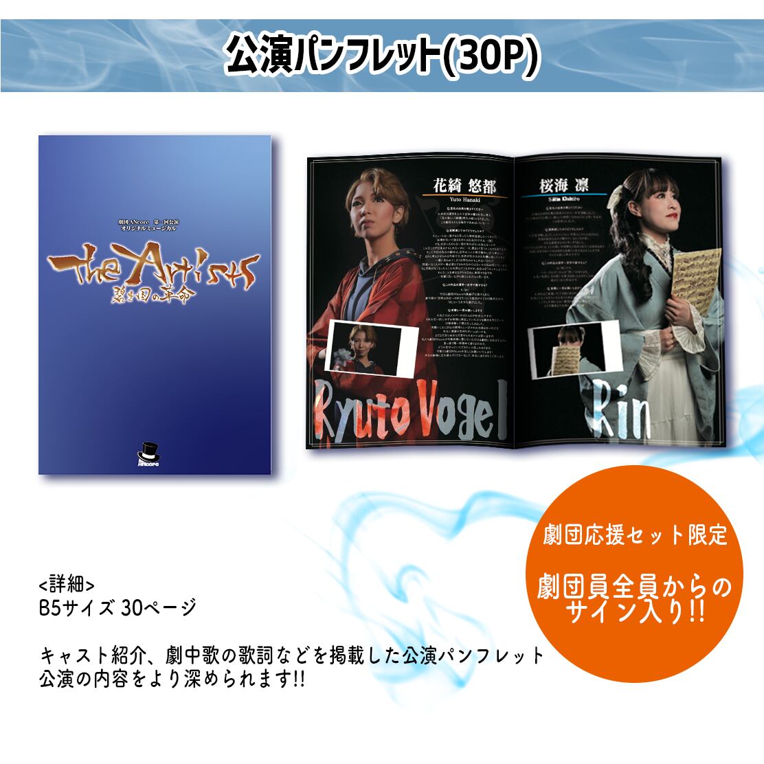 第1回公演『The Artists ~碧き国の革命~』の本番映像を収録したBlu-rayのセットに、事後販売限定のグッズ、そのほか特典盛りだくさんの『劇団応援セット』!